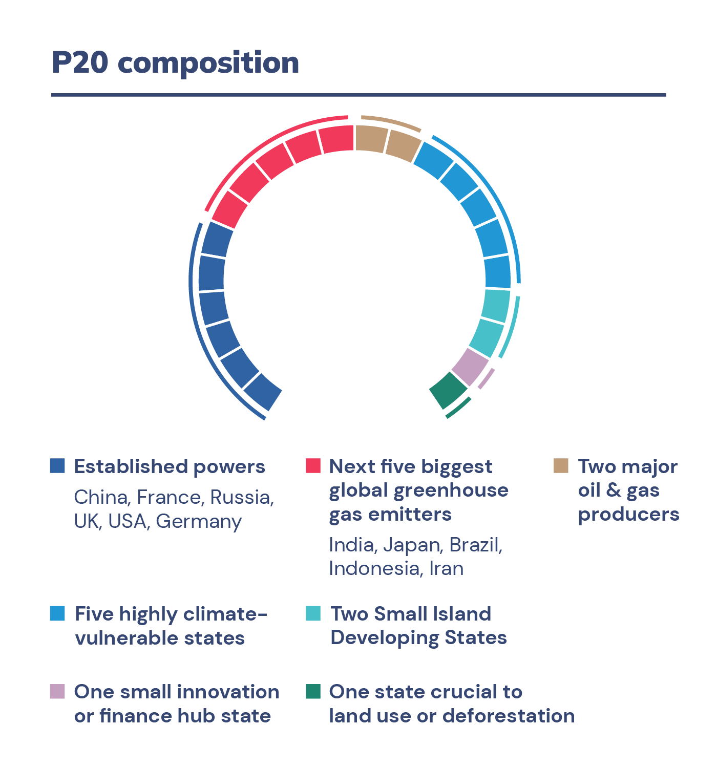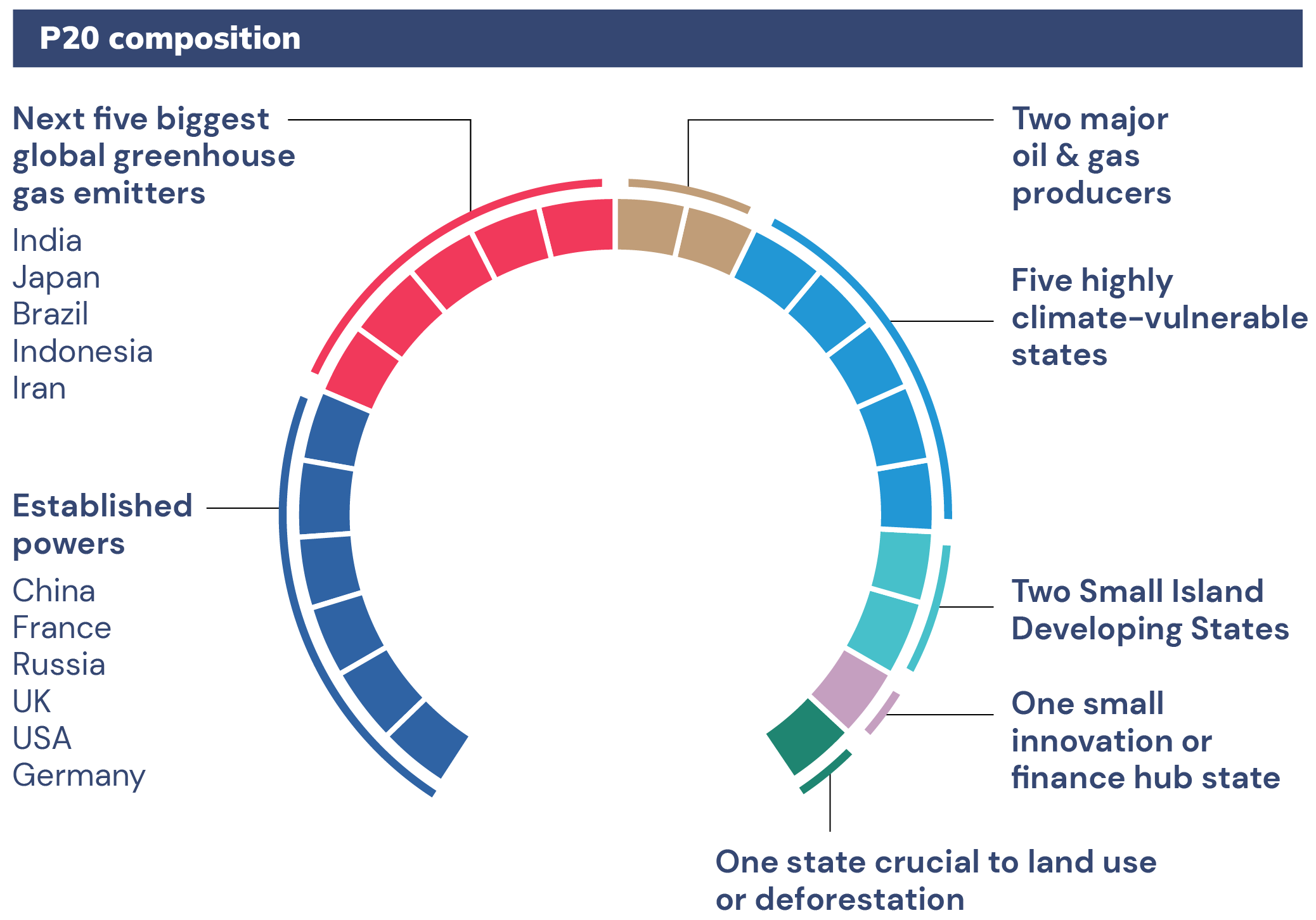 The composition of this new body must reflect the states that are most critical to solving the challenge of climate change while also being inclusive. Thus, the P20 must include great and middle powers, major historical and current emitters, vulnerable states, innovation hubs, and small island states.